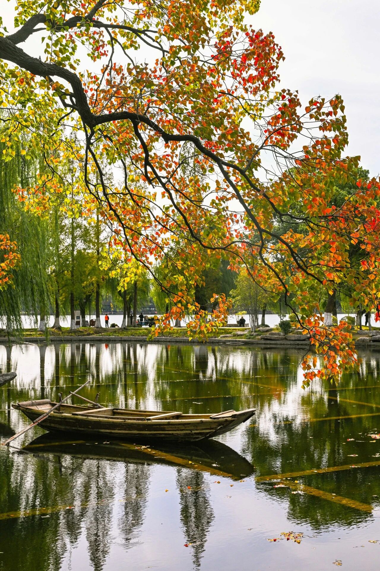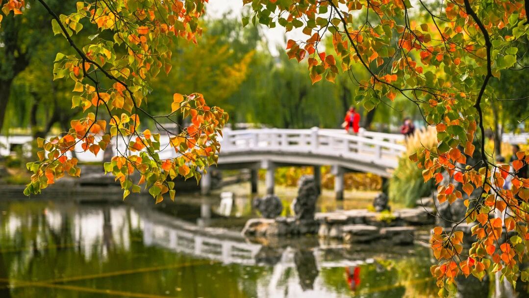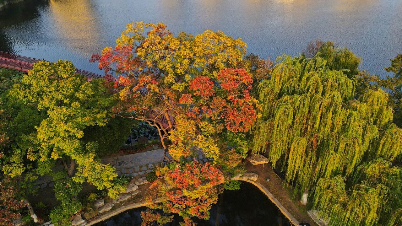 11월 중순부터 하순까지, 북쪽 연꽃정원에 위치한 '가을의 전령'이라 불리며 '소식수(消息樹)'라는 이름을 가진 오구나무(乌桕)는 공원 가을 풍경을 대표하는 상징적인 존재입니다. 물가에 서 있는 나무의 잎은 황금빛에서 점차 짙은 붉은색으로 물들며, 햇살이 비칠 때 특히 눈부시게 빛납니다.